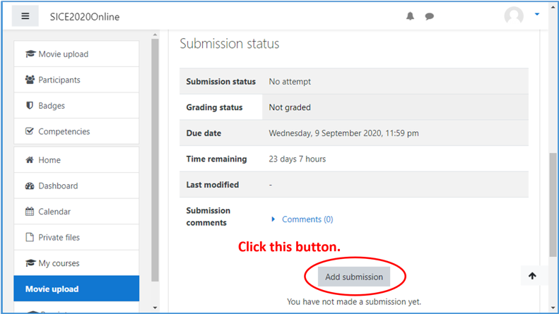 Please go down the “Movie file upload” page to the bottom, and then you will find the button labeled with “Add submission” as shown below. By clicking the “Add submission” button, the region for uploading your video file will appear.