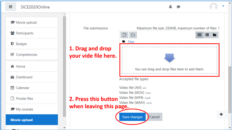 Please drag and drop your video file as shown below, then it starts uploading your video file. After the uploading is completed, please press the button labeled with “Save changes”, then the video file submission is completed. Please do not forget pressing the “Save changes” button, otherwise the uploaded file will not be saved on the submission site.